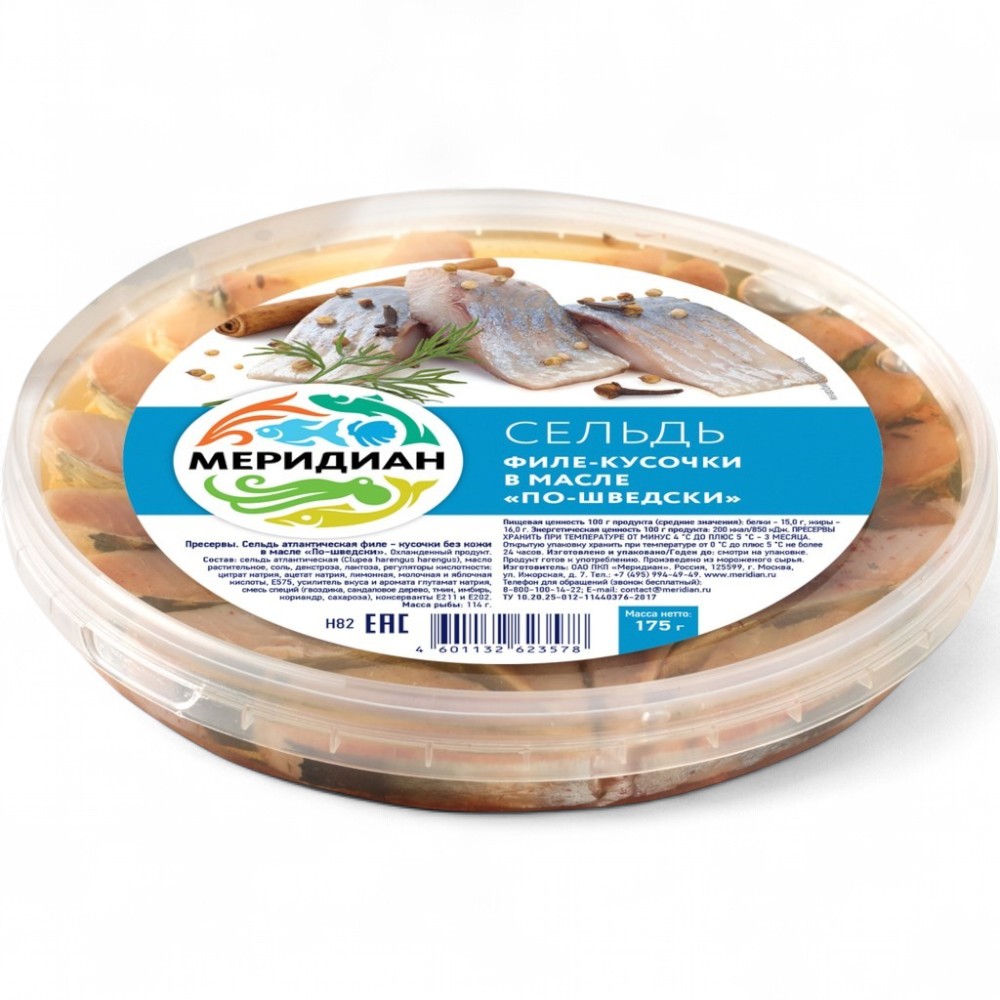 Состав: Филе сельди, масло растительное, соль, сахар, специи (гвоздика, душистый перец).