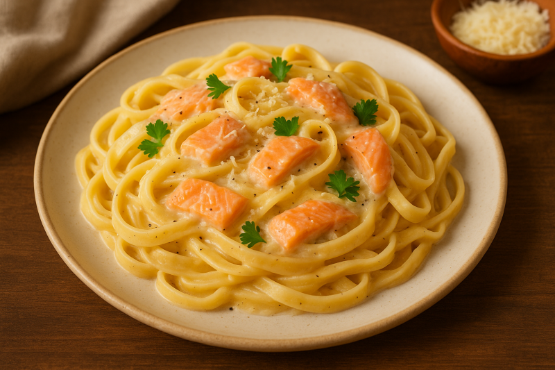 Как подать Разложите пасту по тарелкам, посыпьте пармезаном и зеленью. Сверху можно положить пару тонких ломтиков лосося для красоты. Отлично сочетается с бокалом белого вина, но и просто с чаем или водой — тоже прекрасно. Главное, не торопитесь: паста любит внимание.