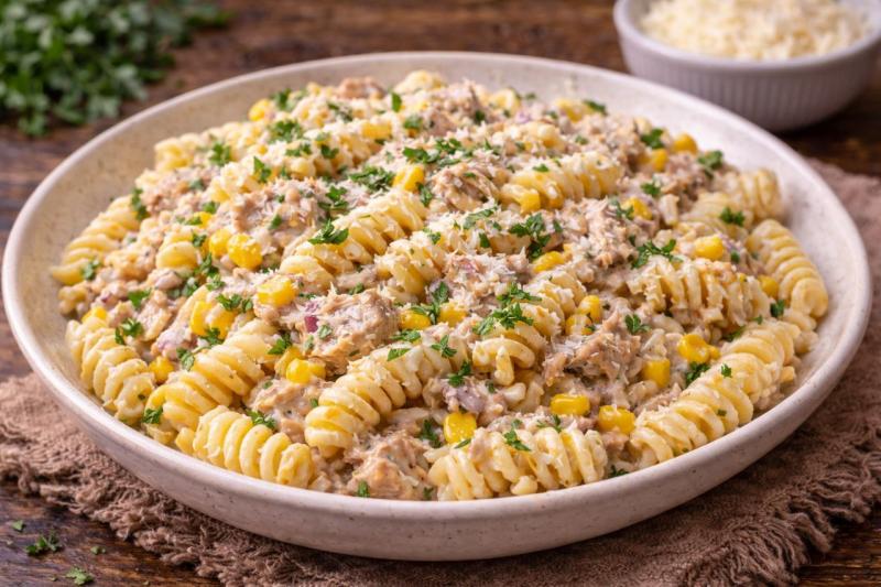 Рецепт хорошо ложится под запросы «паста с тунцом», «паста с кукурузой и сливками», «быстрый ужин с тунцом», что делает его полезным и с точки зрения поисковой выдачи.