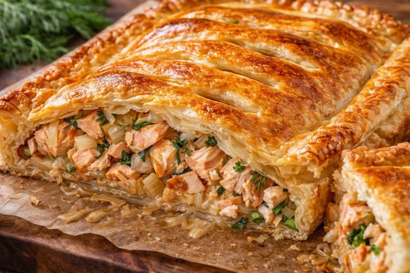 Домашняя выпечка с рыбой — это всегда про уют. Слоёное тесто даёт румяную корочку, а начинка из лосося остаётся сочной и мягкой. Такой пирог удобно подать к ужину, взять с собой или поставить на стол для гостей. В феврале это особенно уместно: тёплая выпечка и аромат рыбы создают ощущение спокойного вечера.