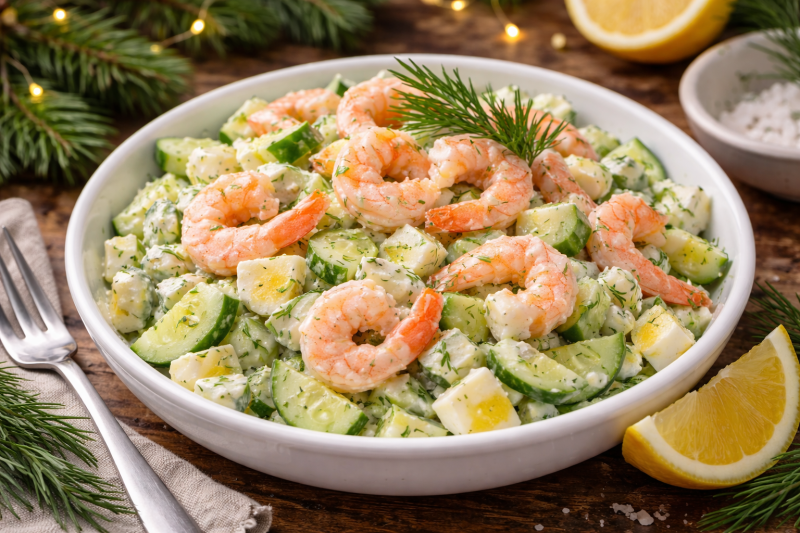 Запах укропа и морской нотки креветок создаёт то самое ощущение «зимнего моря» — лёгкое, чистое и праздничное.