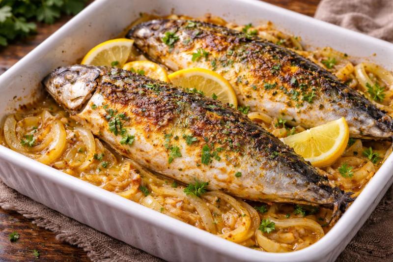Скумбрия — рыба жирная, ароматная и благодарная в приготовлении. В духовке она получается особенно сочной, а лёгкая горчица и запечённый лук делают вкус ярче, но не перебивают естественную морскую нотку. Это простой рецепт скумбрии в духовке, который хорошо подходит для февраля: тепло, сытно и без лишней суеты.