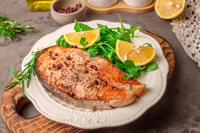 Стейк из сёмги на гриле с лимоном и розмарином.