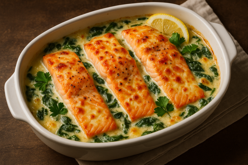 Это одно из тех блюд, которые хочется готовить зимой снова и снова. Тёплое, питательное, с насыщенным сливочным вкусом и лёгким ароматом чеснока. Сёмга — рыба, которая идеально подходит для запекания: она не пересыхает, даже если чуть передержать, а сочетается со сливками и сыром лучше, чем любая другая.