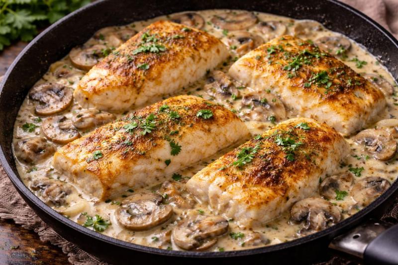 Треска — рыба нежная и довольно нейтральная по вкусу. Именно поэтому она отлично сочетается со сливками и грибами. В этом рецепте филе трески остаётся мягким и сочным, а густой сливочно-грибной соус делает блюдо насыщенным, но без тяжести. Для февраля — хороший вариант тёплого ужина без сложной подготовки.